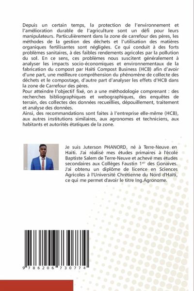 Depuis un certain temps, la protection de l'environnement et l'amélioration durable de l'agriculture sont un défi pour leurs manipulateurs. Particulièrement dans la zone de carrefour des pères, les méthodes de la gestion des déchets et l'utilisation des matières organiques fertilisantes sont négligées. Ce qui conduit à des forts problèmes sanitaires, à des faibles rendements agricoles par la pollution du sol. En ce sens, ces problèmes nous suscitent généralement à analyser les impacts socio-économiques et environnementaux de la fabrication du compost par Haïti Compost Business (HCB) afin d'avoir d'une part, une meilleure compréhension du phénomène de collecte des déchets et le compostage, d'autre part d'analyser les effets d'HCB dans la zone de Carrefour des pères.Pour atteindre l'objectif fixé, on a une méthodologie comprenant : des recherches bibliographiques et webographiques, des enquêtes de terrain, des collectes des données recueillies, dépouillement, traitement et analyse des données.Ainsi, des recommandations sont faites à l'entreprise elle-même (HCB), aux autres institutions similaires, aux agronomes et techniciens, aux habitants et autorités étatiques de la zone.