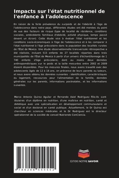 En raison de la forte prévalence du surpoids et de l'obésité à l'âge de l'adolescence dans notre pays, différentes études ont été menées du point de vue des facteurs de risque (type de localité de résidence, conditions sociales, antécédents familiaux d'obésité, activité physique, temps passé devant un écran). Cette étude vise à évaluer l'état nutritionnel et les conditions socio-économiques à l'âge de l'adolescence et à les comparer à l'état nutritionnel à l'âge préscolaire dans la population des localités rurales de l'État de Mexico. Une étude observationnelle transversale rétrospective a été réalisée, incluant 515 enfants de 27 localités réparties dans trois municipalités de l'État de Mexico à partir d'un univers d'échantillonnage de 1 740 enfants d'âge préscolaire, dont au moins deux données anthropométriques sur le poids et la taille mesurées entre 2002 et 2009 étaient disponibles. Pour les mesures finales, nous avons travaillé avec des adolescents âgés de 12 à 16 ans, en présence de leurs parents ou tuteurs, et nous avons obtenu les données suivantes : identification, caractéristiques du logement, ressources pour l'alimentation de la famille, données générales sur les parents, informations postnatales, et les informations suivantes.