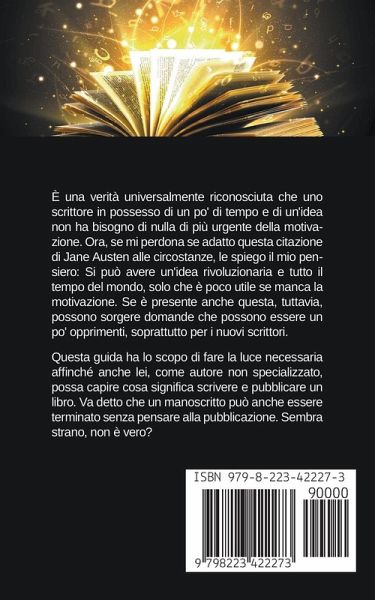 È una verità universalmente riconosciuta che uno scrittore in possesso di un po' di tempo e di un'idea non ha bisogno di nulla di più urgente della motivazione. Ora, se mi perdona se adatto questa citazione di Jane Austen alle circostanze, le spiego il mio pensiero: Si può avere un'idea rivoluzionaria e tutto il tempo del mondo, solo che è poco utile se manca la motivazione. Se è presente anche questa, tuttavia, possono sorgere domande che possono essere un po' opprimenti, soprattutto per i nuovi scrittori. Questa guida ha lo scopo di fare la luce necessaria affinché anche lei, come autore non specializzato, possa capire cosa significa scrivere e pubblicare un libro. Va detto che un manoscritto può anche essere terminato senza pensare alla pubblicazione. Sembra strano, non è vero?