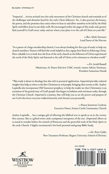 Through Impartial, we are going to journey through the beginnings of the Christian Church as described through Acts 1-10. Impartial was written with the hope and prayer that God uses this journey through Acts to blow your faith wide open. Become men and women of such outrageous faith that you would ask huge things of God just to watch him work. Believe that he is a good, good Father who answers our prayers with complete faithfulness. Impartial is a beautiful look at how God cherished the special time in Acts 1-10 with his covenant people, how he reveled in the salvation of the sons and daughters of Abraham, and ultimately, how he used them to reach the ends of the earth. God is truly an impartial God, one who does not conform to social standards but welcomes every single person into his family. Join in on this journey to learn about our amazing and impartial God!
