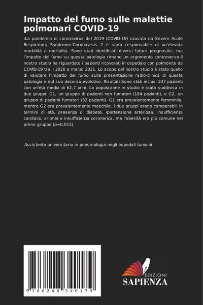 :La pandemia di coronavirus del 2019 (COVID-19) causata da Severe Acute Respiratory Syndrome-Coronavirus 2 è stata responsabile di un'elevata morbilità e mortalità. Sono stati identificati diversi fattori prognostici, ma l'impatto del fumo su questa patologia rimane un argomento controverso.Il nostro studio ha riguardato i pazienti ricoverati in ospedale con polmonite da COVID-19 tra il 2020 e marzo 2021. Lo scopo del nostro studio è stato quello di valutare l'impatto del fumo sulla presentazione radio-clinica di questa patologia e sul suo decorso evolutivo. Risultati Sono stati inclusi 237 pazienti con un'età media di 62,7 anni. La popolazione in studio è stata suddivisa in due gruppi: G1, un gruppo di pazienti non fumatori (184 pazienti), e G2, un gruppo di pazienti fumatori (53 pazienti). G1 era prevalentemente femminile, mentre G2 era prevalentemente maschile. I due gruppi erano comparabili in termini di età, presenza di diabete, ipertensione arteriosa, insufficienza cardiaca, aritmia e insufficienza coronarica, ma l'obesità era più comune nel primo gruppo (p=0,015).