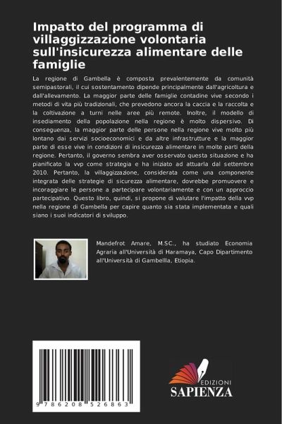 La regione di Gambella è composta prevalentemente da comunità semipastorali, il cui sostentamento dipende principalmente dall'agricoltura e dall'allevamento. La maggior parte delle famiglie contadine vive secondo i metodi di vita più tradizionali, che prevedono ancora la caccia e la raccolta e la coltivazione a turni nelle aree più remote. Inoltre, il modello di insediamento della popolazione nella regione è molto dispersivo. Di conseguenza, la maggior parte delle persone nella regione vive molto più lontano dai servizi socioeconomici e da altre infrastrutture e la maggior parte di esse vive in condizioni di insicurezza alimentare in molte parti della regione. Pertanto, il governo sembra aver osservato questa situazione e ha pianificato la vvp come strategia e ha iniziato ad attuarla dal settembre 2010. Pertanto, la villaggizzazione, considerata come una componente integrata delle strategie di sicurezza alimentare, dovrebbe promuovere e incoraggiare le persone a partecipare volontariamente e con un approccio partecipativo. Questo libro, quindi, si propone di valutare l'impatto della vvp nella regione di Gambella per capire quanto sia stata implementata e quali siano i suoi indicatori di sviluppo.