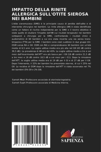 L'otite sieromucosa (SMO) è la principale causa di perdita dell'udito e di intervento chirurgico nei bambini. La rinite allergica (AR) è stata identificata come un fattore di rischio indipendente per la SMO e il nostro obiettivo è stato quello di studiare l'impatto dell'AR sui risultati terapeutici nei bambini sottoposti a chirurgia per la SMO, confrontando i risultati clinici e audiometrici di 60 bambini a cui era stata inserita una via aerea trans-timpanica (TTA) per la SMO. I bambini sono stati suddivisi in due gruppi (GI: OSM senza RA e GII: OSM con RA) e comprendevano 60 bambini con un'età media di 6,5 anni. La soglia uditiva media era più alta nel GII (43 dB contro 39,5 dB). La prevalenza di AR era del 43%. La soglia uditiva media a tre e sei mesi dall'inserimento dell'ATT era più bassa per i GII (18 dB contro 21,5 dB a tre mesi e 16 dB contro 18,5 dB a sei mesi per i G1). Dopo la rimozione dell'ATT, la soglia uditiva media era di 19 dB per il GI e di 27 dB per il GII. Dopo l'intervento, il 32% dei bambini ha presentato otorrea, di cui il 25% nel GII. La recidiva di OSM dopo la rimozione dell'ATT è stata osservata nel 7% dei bambini (5% GII e 2% GII).