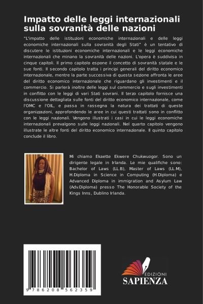 "L'impatto delle istituzioni economiche internazionali e delle leggi economiche internazionali sulla sovranità degli Stati" è un tentativo di discutere le istituzioni economiche internazionali e le leggi economiche internazionali che minano la sovranità delle nazioni. L'opera è suddivisa in cinque capitoli. Il primo capitolo espone il concetto di sovranità statale e le sue fonti. Il secondo capitolo tratta i principi generali del diritto economico internazionale, mentre la parte successiva di questa sezione affronta le aree del diritto economico internazionale che riguardano gli investimenti e il commercio. Si parlerà inoltre delle leggi sul commercio e sugli investimenti in conflitto con le leggi di vari Stati sovrani. Il terzo capitolo fornisce una discussione dettagliata sulle fonti del diritto economico internazionale, come l'OMC e l'OIL, e passa in rassegna la natura dei trattati di queste organizzazioni, approfondendo le aree in cui questi trattati sono in conflitto con le leggi nazionali. Vengono illustrati i casi in cui le leggi economiche internazionali prevalgono sulle leggi nazionali. Nel quarto capitolo vengono illustrate le altre fonti del diritto economico internazionale. Il quinto capitolo conclude il libro.