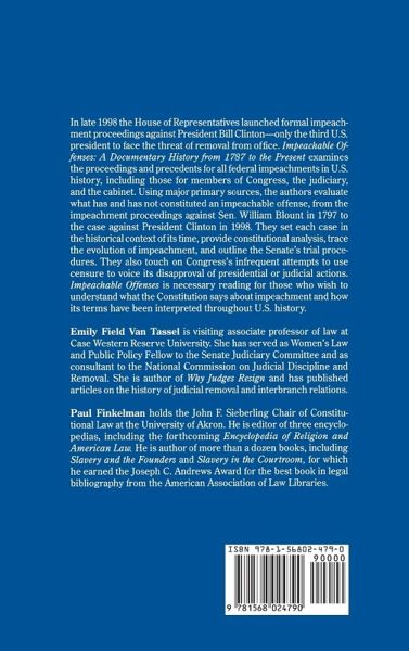 This title is the only book on the topic that includes the major primary sources for evaluation of what has and has not constituted an impeachable offense, including the documents on the investigation of President Clinton as they bear on impeachment. Impeachable Offenses presents the historical proceedings and precedents for impeachment in the U.S., leading up to the current investigation of President Clinton. Focusing on providing a clear understanding of what the Constitution says about impeachment and how its terms have been applied throughout our history, Impeachable Offenses gives readers the perspective they need to make informed decisions. In an easy-to-read style packed with fascinating detail, Impeachable Offenses explores the frequency and reasons impeachment articles have and have not emerged from House investigations in the past 200 years, allowing readers to form their own conclusions on the current case based on the historical record. Impeachable Offenses includes the historical detail and documents on each of the 16 times articles of impeachment have been drawn up, plus the outcome of those investigations that did not lead to impeachment. Impeachable Offenses also includes the entire catalog of potentially impeachable offenses in the Starr Report, the impeachment-related clauses from the Constitution, and a discussion of the Senate's trial procedures.