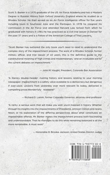The author, a Harvard Law School graduate and a distinguished trial lawyer, brings to the reader, through insights into the Clinton and Johnson impeachments and the Nixon near impeachment, an understanding of the process of impeachment, the differing of what constitutes an impeachable offense, and an exploration of those differing perspectives. The author takes the reader through a colorful journey through the pages of history starting with the English Parliament in 1376 then journeying forward through the years to the United States Constitutioal Convention in 1787 then onward to the impeachments of Andrew Johnson, the near impeachment of Richard Nixon and the actual impeachment of William Clinton. It is a fascinating journey that brings a full understanding of the impeachment process to a reader who wants ot know and understand the process.