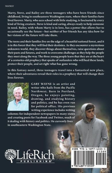 Marty, Steve, and Bailey are three teenagers who have been friends since childhood, living in southeastern Washington state, where their families have lived forever. Marty, who aces school with little studying, is fascinated by every kind of living creature. Steve is kind and caring, always ready to help someone in need. Bailey, with whom Marty is in love, has a power that allows her to occasionally see the futurebut neither of her friends has any idea how far her visions of the future will take them. The teens and their families live on the edge of a beautiful national forest, and it is in this forest that they will find their destinies. As they encounter a mysterious unknown world, they discover things about themselves, raise questions about their pasts and futures, and work to overcome challenges as they help the people they meet along the way. The three young people learn that they are at the heart of a centuries-old prophecy that speaks of outlanders who will heal these lands, protect their people, and set right what has gone wrong. In this fantasy novel, three teenagers travel into a fantastical new place, where their adventures reveal their roles in a prophesy that will change their lives forever.