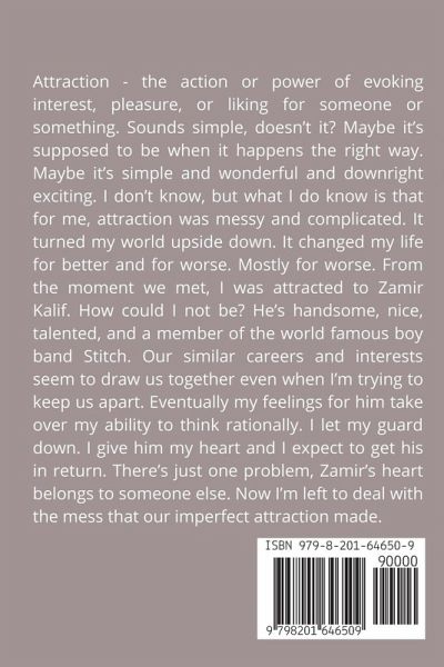 Attraction - the action or power of evoking interest, pleasure, or liking for someone or something. Sounds simple, doesn't it? Maybe it's supposed to be when it happens the right way. Maybe it's simple and wonderful and downright exciting. I don't know, but what I do know is that for me, attraction was messy and complicated. It turned my world upside down. It changed my life for better and for worse. Mostly for worse. From the moment we met, I was attracted to Zamir Kalif. How could I not be? He's handsome, nice, talented, and a member of the world famous boy band Stitch. Our similar careers and interests seem to draw us together even when I'm trying to keep us apart. Eventually my feelings for him take over my ability to think rationally. I let my guard down. I give him my heart and I expect to get his in return. There's just one problem, Zamir's heart belongs to someone else. Now I'm left to deal with the mess that our imperfect attraction made.