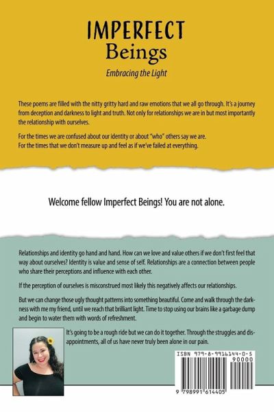These poems are filled with the nitty gritty hard and raw emotions that we all go through. It's a journey from deception and darkness to light and truth. Not only for relationships we are in but most importantly the relationship with ourselves. For the times we are confused about our identity or about "who" others say we are. For the times that we don't measure up and feel as if we've failed at everything. Welcome fellow Imperfect Beings! You are not alone. Relationships and identity go hand and hand. How can we love and value others if we don't first feel that way about ourselves? Identity is value and sense of self. Relationships are a connection between people who share their perceptions and influence with each other. If the perception of ourselves is misconstrued most likely this negatively affects our relationships. But we can change those ugly thought patterns into something beautiful. Come and walk through the darkness with me my friend, until we reach that brilliant light. Time to stop using our brains like a garbage dump and begin to water them with words of refreshment. It's going to be a rough ride but we can do it together. Through the struggles and disappointments, all of us have never truly been alone in our pain.