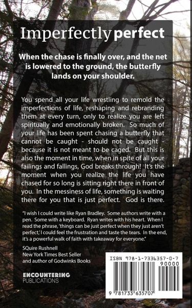 "You spend all your life wrestling to remold the imperfections of life, reshaping and rebranding them at every turn, only to realize you are left spiritually and emotionally broken. So much of your life has been spent chasing a butterfly who cannot be caught - who should not be caught - because he is not meant to be caged. But this is also the moment in time, when in spite of all your failings and fallings, God breaks through! It's the moment when you realize the life you have chased for so long is sitting right there in front of you. In the messiness of life, something is waiting there for you that is just perfect. God is there. When the chase is finally over, and the net is lowered to the ground, the butterfly lands on your shoulder." - Ryan J. Bradley