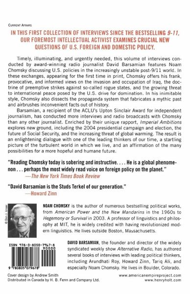 In this first collection of interviews since the bestselling 9-11, our foremost intellectual activist examines crucial new questions of U.S. foreign policy Timely, urgent, and powerfully elucidating, this important volume of previously unpublished interviews conducted by award-winning radio journalist David Barsamian features Noam Chomsky discussing America's policies in an increasingly unstable world. With his famous insight, lucidity, and redoubtable grasp of history, Chomsky offers his views on the invasion and occupation of Iraq, the doctrine of "preemptive" strikes against so-called rogue states, and the prospects of the second Bush administration, warning of the growing threat to international peace posed by the U.S. drive for domination. In his inimitable style, Chomsky also dissects the propaganda system that fabricates a mythic past and airbrushes inconvenient facts out of history. Barsamian, recipient of the ACLU's Upton Sinclair Award for independent journalism, has conducted more interviews and radio broadcasts with Chomsky than has any other journalist. Enriched by their unique rapport, Imperial Ambitions explores topics Chomsky has never before discussed, among them the 2004 presidential campaign and election, the future of Social Security, and the increasing threat, including devastating weather patterns, of global warming. The result is an illuminating dialogue with one of the leading thinkers of our time-and a startling picture of the turbulent times in which we live.