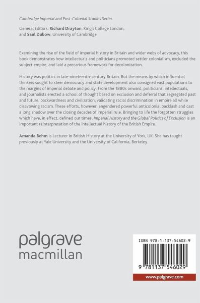 Examining the rise of the field of imperial history in Britain and wider webs of advocacy, this book demonstrates how intellectuals and politicians promoted settler colonialism, excluded the subject empire, and laid a precarious framework for decolonization. History was politics in late-nineteenth-century Britain. But the means by which influential thinkers sought to steer democracy and state development also consigned vast populations to the margins of imperial debate and policy. From the 1880s onward, politicians, intellectuals, and journalists erected a school of thought based on exclusion and deferral that segregated past and future, backwardness and civilization, validating racial discrimination in empire all while disavowing racism. These efforts, however, engendered powerful anticolonial backlash and cast a long shadow over the closing decades of imperial rule. Bringing to life the forgotten struggles which have, in effect, defined our times, Imperial Historyand the Global Politics of Exclusion is an important reinterpretation of the intellectual history of the British Empire.