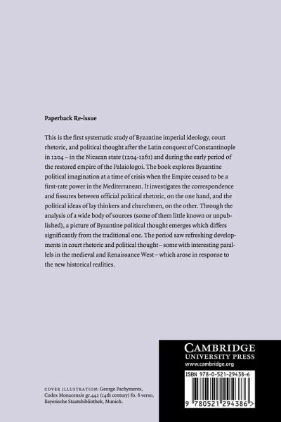 This study is the first to systematically investigate Byzantine imperial ideology, court rhetoric and political thought after the Latin conquest of Constantinople in 1204 - in the Nicaean state (1204-61) and during the early period of the restored empire of the Palaiologoi. The book explores Byzantine political imagination at a time of crisis when the Empire ceased to be a first-rate power in the Mediterranean. It investigates the correspondence and fissures between official political rhetoric, on the one hand, and the political ideas of lay thinkers and churchmen, on the other. Through the analysis of a wide body of sources, a picture of Byzantine political thought emerges which differs significantly from the traditional one. The period saw refreshing developments in court rhetoric and political thought, some with interesting parallels in the medieval and Renaissance West, which arose in response to the new historical realities.