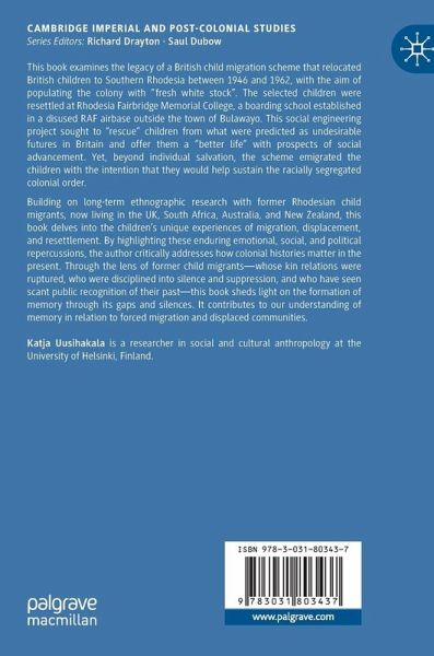 This book examines the legacy of a British child migration scheme that relocated British children to Southern Rhodesia between 1946 and 1962, with the aim of populating the colony with "fresh white stock". The selected children were resettled at Rhodesia Fairbridge Memorial College, a boarding school established in a disused RAF airbase outside the town of Bulawayo. This social engineering project sought to "rescue" children from what were predicted as undesirable futures in Britain and offer them a "better life" with prospects of social advancement. Yet, beyond individual salvation, the scheme emigrated the children with the intention that they would help sustain the racially segregated colonial order.