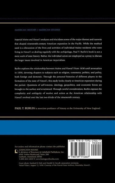Burlin's book provides an analysis of some of the broad themes and currents of 19th century American expansion in the Pacific through a discussion of a number of Maine inhabitants, either going to Hawai'i or other areas of the archipelago. Individuals covered include Sanford Dole, Luther Secerance, John L. Stevens, and James G. Blaine.