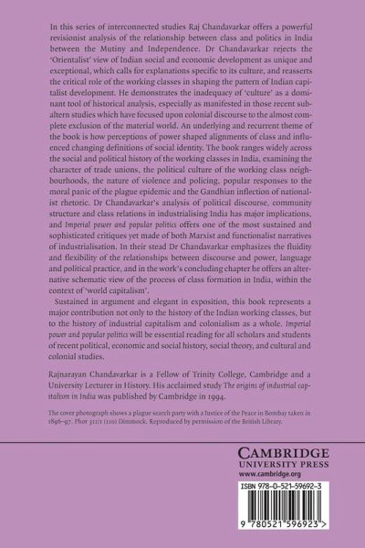 In this series of interconnected essays, Rajnarayan Chandavarkar offers a powerful revisionist analysis of the relationship between class and politics in India between the Mutiny and Independence. Dr Chandavarkar rejects the 'Orientalist' view of Indian social and economic development as exceptional and somehow distinct from that prevailing in capitalist societies elsewhere, and reasserts the critical role of the working classes in shaping the pattern of Indian capitalist development. Sustained in argument and elegant in exposition, these essays represent a major contribution not only to the history of the Indian working classes, but to the history of industrial capitalism and colonialism as a whole. Imperial Power and Popular Politics will be essential reading for all scholars and students of recent political, economic, and social history, social theory, and cultural and colonial studies.