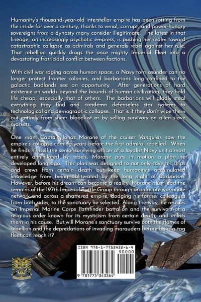 Humanity's thousand-year-old interstellar empire has been rotting from the inside for over a century, thanks to venal, corrupt, and power-hungry sovereigns from a dynasty many consider illegitimate. The latest in that lineage, an increasingly psychotic empress, is pushing her realm toward catastrophic collapse as admirals and generals rebel against her rule. That rebellion quickly drags the once mighty Imperial Fleet into a devastating fratricidal conflict between factions. With civil war raging across human space, a Navy torn asunder can no longer protect frontier colonies, and barbarians long confined to the galactic badlands see an opportunity. After generations of hard existence on worlds beyond the bounds of human civilization, they hold life cheap, especially that of others. The barbarians will gladly steal everything they find and condemn defenseless star systems to technological and demographic collapse. That is if they don't wipe them out entirely from sheer bloodlust or by selling survivors on alien slave markets. One man, Captain Jonas Morane of the cruiser Vanquish, saw the empire's collapse coming years before the first admiral rebelled. When he finds himself the senior surviving officer of a loyalist Navy unit almost entirely annihilated by rebels, Morane puts in motion a plan he developed long ago. This plan was designed to not only save his ships and crews from certain death but keep humanity's accumulated knowledge from being obliterated by the long night of barbarism. However, before his dream can become a reality, Morane must lead the remains of the 197th Imperial Battle Group through an intricate wormhole network across a shattered empire, dodging his former colleagues from both sides, to the sanctuary he selected. Along the way, he rescues an Imperial Marine Corps Pathfinder battalion and the survivors of a religious order known for its mysticism from certain death, and enlists them in his cause. But will Morane's sanctuary survive both the flames of rebellion and the depredations of invading marauders before his rag-tag fleet can reach it? Imperial Sunset is the first installment in Eric Thomson's new saga Ashes of Empire. It tells the story of a desperate attempt to stave off the darkness threatening to smother humanity's interstellar empire and send civilization back to the Stone Age. Ashes of Empire is set in the Siobhan Dunmoore, Decker's War, and Quis Custodiet universe, but a thousand years after Zack Decker and Caelin Morrow's day, when they and Siobhan Dunmoore have become no more than minor footnotes in human history.