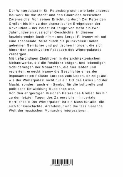 Der Winterpalast in St. Petersburg steht wie kein anderes Bauwerk für die Macht und den Glanz des russischen Zarenreichs. Von seiner Errichtung durch Zar Peter den Großen bis zu den dramatischen Ereignissen der Revolution - der Palast ist Zeuge von mehr als zwei Jahrhunderten russischer Geschichte. In diesem faszinierenden Buch nimmt uns Sergej F. Ivanov mit auf eine spannende Reise durch die prunkvollen Hallen, geheimen Gemächer und politischen Intrigen, die sich hinter den prachtvollen Fassaden des Winterpalastes verbergen.Mit tiefgründigen Einblicken in die architektonischen Meisterwerke, die die Residenz prägen, und lebendigen Schilderungen der Monarchen, die hier lebten und regierten, erweckt Ivanov die Geschichte eines der imposantesten Paläste Europas zum Leben. Er zeigt auf, wie der Winterpalast nicht nur ein Ort des Luxus und der Macht, sondern auch ein Symbol für die kulturelle und politische Entwicklung Russlands war.Von den ehrgeizigen Visionen Peters des Großen bis hin zu den letzten Tagen des Zarenreichs - Imperiale Herrlichkeit: Der Winterpalast ist ein Muss für alle, die sich für Geschichte, Architektur und die faszinierende Welt der russischen Monarchie interessieren.