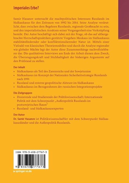 Samir Hasanov untersucht die machtpolitischen Interessen Russlands im Südkaukasus für den Zeitraum von 1992 bis 2014. Seine Analyse verdeutlicht, dass zwischen dem Begehren Russlands, regionale Großmacht zu sein, und den imperialistischen Ansätzen seiner Vergangenheit eine Verknüpfung besteht. Der Autor beschäftigt sich dabei mit der Frage, ob das auf althergebrachte Herrschaftspraktiken gestützte Vorgehen Moskaus im Südkaukasus stabilitätsfördernder oder konfliktstimulierender Natur ist. Mittels einer Vielzahl von klassischen Theoriemodellen und durch die Analyse regionaler wie globaler Mächte legt der Autor diese Zusammenhänge nachvollziehbarer dar. Die qualitativen Interviews am Ende der Arbeit dienen dem Zweck, die Überzeugungskraft und Stichhaltigkeit der bisherigen Argumente auf den Prüfstand zu stellen.