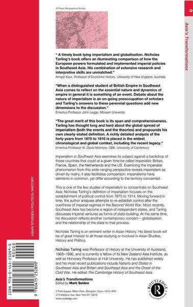 Imperialism in Southeast Asia examines its subject against a backdrop of those countries that could at a given time be called imperialist: Britain, France, Spain, the Netherlands and the US. Examining the imperialist phenomenon from this wide-ranging perspective reveals imperialism as driven by rivalry; it also facilitates comparison: imperialism has elements in common, yet differs according to the territory in which it operates. This is one of the few studies of imperialism to concentrate on Southeast Asia. Nicholas Tarling's definition of imperialism focuses on the establishment of political control from 1870 to 1914. Moving forward in time, the author analyses attempts to re-establish control after the overthrow of imperial regimes in the Second World War. Most recently, Southeast Asia has become a region of independent states, and Tarling discusses imperial ventures as forms of state-building. At the same time, his discussion reflects another contemporary concern-globalisation and the relationship of the state to that process. Nicolas Tarling is an eminent writer in Asian history. His latest book will be of great interest to all those studying or involved in Asian studies, history and politics.