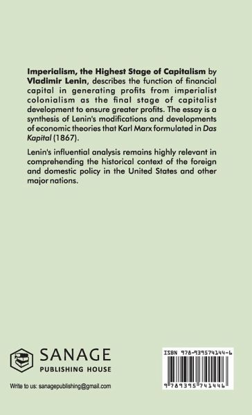 Imperialism, the Highest Stage of Capitalism by Vladimir Lenin, describes the function of financial capital in generating profits from imperialist colonialism as the final stage of capitalist development to ensure greater profits. The essay is a synthesis of Lenin's modifications and developments of economic theories that Karl Marx formulated in Das Kapital (1867). Lenin's influential analysis remains highly relevant in comprehending the historical context of the foreign and domestic policy in the United States and other major nations.