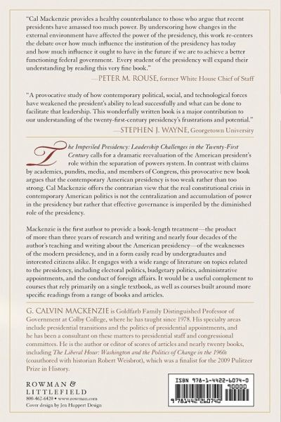 The Imperiled Presidency: Presidential Leadership in the 21st Century calls for a dramatic re-evaluation of the American president's role within the separation of powers system. In contrast with claims by academics, pundits, media, and members of Congress, Cal Mackenzie offers the contrarian argument that the real constitutional crisis in contemporary American politics is not the centralization and accumulation of power in the presidency (the "imperial presidency" argument), but rather that effective governance is imperiled by the diminished role of the presidency. The product of more than three years of research and writing and nearly four decades of the author's teaching and writing about the American presidency, The Imperiled Presidency is the first book-length treatment of the weaknesses of the modern presidency, written to be accessible to undergraduates and interested citizens alike.