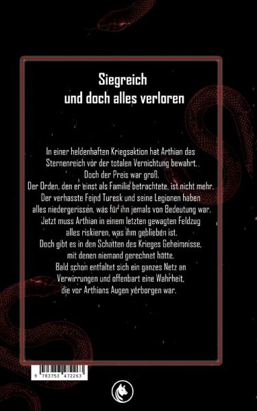 Siegreich und doch alles verloren.In einer heldenhaften Kriegsaktion hat Arthian das Sternenreich vor der totalen Vernichtung bewahrt. Doch der Preis war groß. Der Orden, den er einst als Familie betrachtete, ist nicht mehr. Der verhasste Feind Turesk und seine Legionen haben alles niedergerissen, was für ihn jemals von Bedeutung war. Jetzt muss Arthian in einem letzten gewagten Feldzug alles riskieren, was ihm geblieben ist. Doch gibt es in den Schatten des Krieges Geheimnisse, mit denen niemand gerechnet hätte. Bald schon entfaltet sich ein ganzes Netz an Verwirrungen und offenbart eine Wahrheit, die vor Arthians Augen verborgen war.
