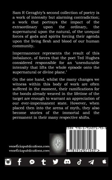 Sam R Geraghty's second collection of poetry is a work of intensity but alarming contradiction; a work that portrays the impact of the extraordinary upon the ordinary, the supernatural upon the natural, of the unequal forces of gods and spirits forcing their agenda upon the living flesh and blood of our human community. Impermanence represents the result of this imbalance, of forces that the poet Ted Hughes considered responsible for an 'unendurable intensity that lifts the whole episode onto the supernatural or divine plane.' On the one hand, whilst the many changes we witness within this body of work are often suffered in the moment, their ramifications for the bonds already weaved in the lifetime of the target are enough to warrant an appreciation of our ever-impermanent state. However, when placed then into the arena of myth, they also become stories of the immortal and the permanent in their many respective shifts.