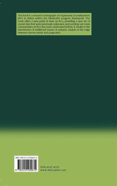 This book is a research monograph on impersonal si constructions (ISC) in Italian within the Minimalist program framework. The book offers a new point of view on ISCs, providing a new set of crucial data that were previously unknown, and pointing out many characteristics of ISCs that were overlooked before. It results in the introduction of additional means of syntactic analysis at the edge between narrow syntax and pragmatics.