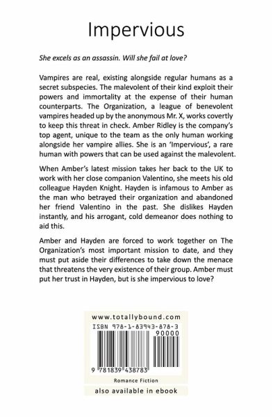 She excels as an assassin. Will she fail at love? Vampires are real, existing alongside regular humans as a secret subspecies. The malevolent of their kind exploit their powers and immortality at the expense of their human counterparts. The Organization, a league of benevolent vampires headed up by the anonymous Mr. X, works covertly to keep this threat in check. Amber Ridley is the company’s top agent, unique to the team as the only human working alongside her vampire allies. She is an ‘Impervious’, a rare human with powers that can be used against the malevolent. When Amber’s latest mission takes her back to the UK to work with her close companion Valentino, she meets his old colleague Hayden Knight. Hayden is infamous to Amber as the man who betrayed their organization and abandoned her friend Valentino in the past. She dislikes Hayden instantly, and his arrogant, cold demeanor does nothing to aid this. Amber and Hayden are forced to work together on The Organization’s most important mission to date, and they must put aside their differences to take down the menace that threatens the very existence of their group. Amber must put her trust in Hayden, but is she impervious to love?