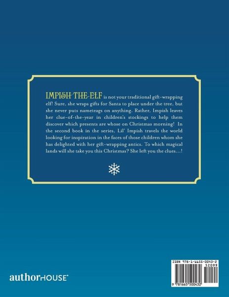 Impish the Elf is not your traditional gift-wrapping elf! Sure, she wraps gifts for Santa to place under the tree, but she never puts nameteags on anything. Rather, Impish leaves her clue-of-the-year in children's stockings to help them discover which presents are whose on Christmas morning! In the second book in the series, Lil' Impish travels the world looking for inspiration in the faces of those children whom she has delighted with her gift-wrapping antics. To which magical lands will she take you this Christmas? She left you the clues...!