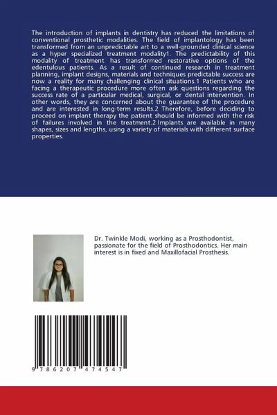 The introduction of implants in dentistry has reduced the limitations of conventional prosthetic modalities. The field of implantology has been transformed from an unpredictable art to a well-grounded clinical science as a hyper specialized treatment modality1. The predictability of this modality of treatment has transformed restorative options of the edentulous patients. As a result of continued research in treatment planning, implant designs, materials and techniques predictable success are now a reality for many challenging clinical situations.1 Patients who are facing a therapeutic procedure more often ask questions regarding the success rate of a particular medical, surgical, or dental intervention. In other words, they are concerned about the guarantee of the procedure and are interested in long-term results.2 Therefore, before deciding to proceed on implant therapy the patient should be informed with the risk of failures involved in the treatment.2 Implants are available in many shapes, sizes and lengths, using a variety of materials with different surface properties.