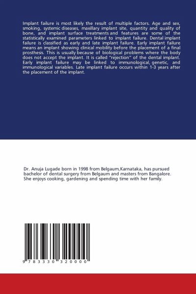 Implant failure is most likely the result of multiple factors. Age and sex, smoking, systemic diseases, maxillary implant site, quantity and quality of bone, and implant surface treatments and features are some of the statistically examined parameters linked to implant failure. Dental implant failure is classified as early and late implant failure. Early implant failure means an implant showing clinical mobility before the placement of a final prosthesis. This is usually because of biological problems where the body does not accept the implant. It is called "rejection" of the dental implant. Early implant failure may be linked to immunological, genetic, and immunological variables. Late implant failure occurs within 1-3 years after the placement of the implant.