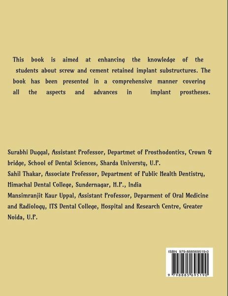 Screw retained versus cement-retained implant prostheses stands in favour of the fact that the upcoming methodologies in dental sciences are no exception to the trend of focusing on even finer details in materials, impression techniques and prostheses currently used in implant dentistry. Many hopes are pinned on implant dentistry that it will bring tangible benefits to the new dental world from the bench to the clinical level. This book showcases a few applications that fall into the scope of implant prostheses-based techniques as a way of improving and transforming substructures into solid bases for novel methods to be applied in future applications in implant esthetics.