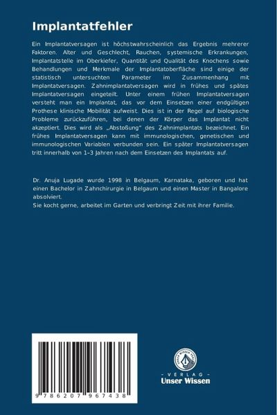 Ein Implantatversagen ist höchstwahrscheinlich das Ergebnis mehrerer Faktoren. Alter und Geschlecht, Rauchen, systemische Erkrankungen, Implantatstelle im Oberkiefer, Quantität und Qualität des Knochens sowie Behandlungen und Merkmale der Implantatoberfläche sind einige der statistisch untersuchten Parameter im Zusammenhang mit Implantatversagen. Zahnimplantatversagen wird in frühes und spätes Implantatversagen eingeteilt. Unter einem frühen Implantatversagen versteht man ein Implantat, das vor dem Einsetzen einer endgültigen Prothese klinische Mobilität aufweist. Dies ist in der Regel auf biologische Probleme zurückzuführen, bei denen der Körper das Implantat nicht akzeptiert. Dies wird als "Abstoßung" des Zahnimplantats bezeichnet. Ein frühes Implantatversagen kann mit immunologischen, genetischen und immunologischen Variablen verbunden sein. Ein später Implantatversagen tritt innerhalb von 1-3 Jahren nach dem Einsetzen des Implantats auf.