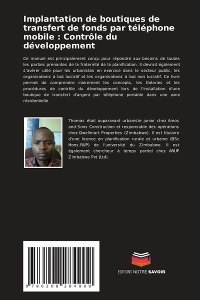 Ce manuel est principalement conçu pour répondre aux besoins de toutes les parties prenantes de la fraternité de la planification. Il devrait également s'avérer utile pour les urbanistes en exercice dans le secteur public, les organisations à but lucratif et les organisations à but non lucratif. Ce livre permet de comprendre clairement les concepts, les théories et les procédures de contrôle du développement lors de l'installation d'une boutique de transfert d'argent par téléphone portable dans une zone résidentielle.