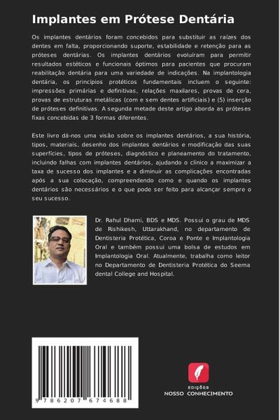 Os implantes dentários foram concebidos para substituir as raízes dos dentes em falta, proporcionando suporte, estabilidade e retenção para as próteses dentárias. Os implantes dentários evoluíram para permitir resultados estéticos e funcionais óptimos para pacientes que procuram reabilitação dentária para uma variedade de indicações. Na implantologia dentária, os princípios protéticos fundamentais incluem o seguinte: impressões primárias e definitivas, relações maxilares, provas de cera, provas de estruturas metálicas (com e sem dentes artificiais) e (5) inserção de próteses definitivas. A segunda metade deste artigo aborda as próteses fixas concebidas de 3 formas diferentes. Este livro dá-nos uma visão sobre os implantes dentários, a sua história, tipos, materiais, desenho dos implantes dentários e modificação das suas superfícies, tipos de próteses, diagnóstico e planeamento do tratamento, incluindo falhas com implantes dentários, ajudando o clínico a maximizar a taxa de sucesso dos implantes e a diminuir as complicações encontradas após a sua colocação, compreendendo como e quando os implantes dentários são necessários e o que pode ser feito para alcançar sempre o seu sucesso.
