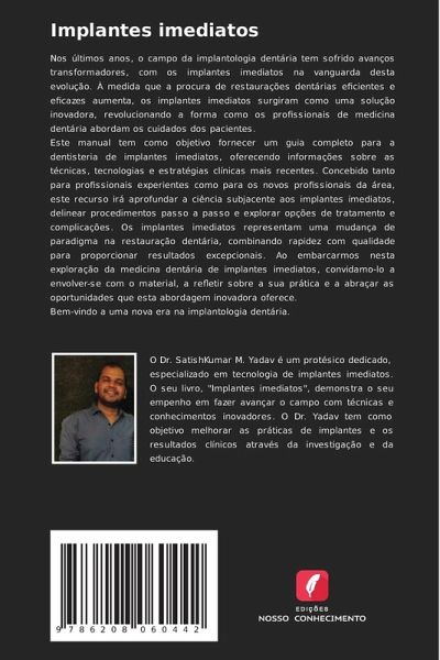 Nos últimos anos, o campo da implantologia dentária tem sofrido avanços transformadores, com os implantes imediatos na vanguarda desta evolução. À medida que a procura de restaurações dentárias eficientes e eficazes aumenta, os implantes imediatos surgiram como uma solução inovadora, revolucionando a forma como os profissionais de medicina dentária abordam os cuidados dos pacientes.Este manual tem como objetivo fornecer um guia completo para a dentisteria de implantes imediatos, oferecendo informações sobre as técnicas, tecnologias e estratégias clínicas mais recentes. Concebido tanto para profissionais experientes como para os novos profissionais da área, este recurso irá aprofundar a ciência subjacente aos implantes imediatos, delinear procedimentos passo a passo e explorar opções de tratamento e complicações. Os implantes imediatos representam uma mudança de paradigma na restauração dentária, combinando rapidez com qualidade para proporcionar resultados excepcionais. Ao embarcarmos nesta exploração da medicina dentária de implantes imediatos, convidamo-lo a envolver-se com o material, a refletir sobre a sua prática e a abraçar as oportunidades que esta abordagem inovadora oferece.Bem-vindo a uma nova era na implantologia dentária.