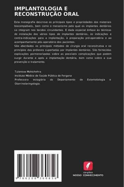 Esta monografia descreve os principais tipos e propriedades dos materiais biocompatíveis, bem como o mecanismo pelo qual os implantes dentários se integram nos tecidos circundantes. É dada especial ênfase às técnicas de instalação dos vários tipos de implantes dentários, às indicações e contra-indicações para a implantação, à preparação pré-operatória e ao acompanhamento pós-operatório dos pacientes. São abordados os principais métodos de cirurgia oral reconstrutiva e os princípios das próteses suportadas por implantes dentários. São fornecidas explicações pormenorizadas sobre as possíveis complicações que podem surgir durante e após a implantação dentária, bem como sobre a sua prevenção e tratamento.