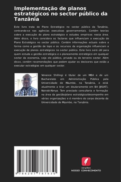 Este livro trata do Plano Estratégico no sector público da Tanzânia, centrando-se nas agências executivas governamentais. Contém teorias sobre a execução do plano estratégico e estudos empíricos nesta área. Além disso, o livro considera os factores que influenciam a execução do Plano Estratégico no sector público. Contém informações actuais sobre a forma como a gestão de topo e os recursos da organização influenciam a execução de planos estratégicos no sector público. Este livro será útil para quem estuda a gestão estratégica e o planeamento estratégico em qualquer sector da economia, seja ele público, privado ou do terceiro sector. Além disso, contém recomendações que podem ajudar os decisores que estão a executar estratégias em qualquer sector.