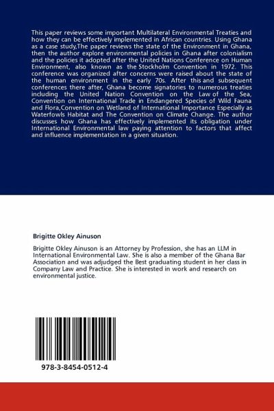 This paper reviews some important Multilateral Environmental Treaties and how they can be effectively implemented in African countries. Using Ghana as a case study,The paper reviews the state of the Environment in Ghana, then the author explore environmental policies in Ghana after colonialism and the policies it adopted after the United Nations Conference on Human Environment, also known as the Stockholm Convention in 1972. This conference was organized after concerns were raised about the state of the human environment in the early 70s. After this and subsequent conferences there after, Ghana become signatories to numerous treaties including the United Nation Convention on the Law of the Sea, Convention on International Trade in Endangered Species of Wild Fauna and Flora,Convention on Wetland of International Importance Especially as Waterfowls Habitat and The Convention on Climate Change. The author discusses how Ghana has effectively implemented its obligation under International Environmental law paying attention to factors that affect and influence implementation in a given situation.