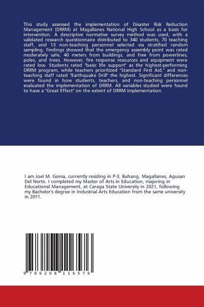 This study assessed the implementation of Disaster Risk Reduction Management (DRRM) at Magallanes National High School as a basis for intervention. A descriptive normative survey method was used, with a validated research questionnaire distributed to 340 students, 70 teaching staff, and 13 non-teaching personnel selected via stratified random sampling. Findings showed that the emergency assembly point was rated moderately safe, 40 meters from buildings, and free from powerlines, poles, and trees. However, fire response resources and equipment were rated low. Students rated "basic life support" as the highest-performing DRRM program, while teachers prioritized "Standard First Aid," and non-teaching staff rated "Earthquake Drill" the highest. Significant differences were found in how students, teachers, and non-teaching personnel evaluated the implementation of DRRM. All variables studied were found to have a "Great Effect" on the extent of DRRM implementation.