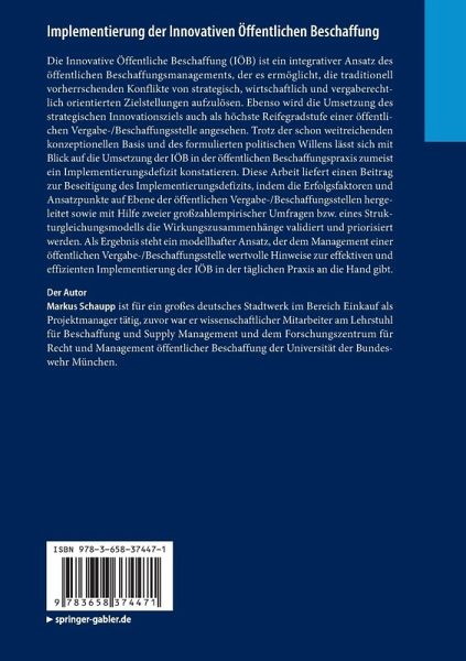 Die Innovative Öffentliche Beschaffung (IÖB) ist ein integrativer Ansatz des öffentlichen Beschaffungsmanagements, der es ermöglicht, die traditionell vorherrschenden Konflikte von strategisch, wirtschaftlich und vergaberechtlich orientierten Zielstellungen aufzulösen. Ebenso wird die Umsetzung des strategischen Innovationsziels auch als höchste Reifegradstufe einer öffentlichen Vergabe-/Beschaffungsstelle angesehen. Trotz der schon weitreichenden konzeptionellen Basis und des formulierten politischen Willens lässt sich mit Blick auf die Umsetzung der IÖB in der öffentlichen Beschaffungspraxis zumeist ein Implementierungsdefizit konstatieren. Diese Arbeit liefert einen Beitrag zur Beseitigung des Implementierungsdefizits, indem die Erfolgsfaktoren und Ansatzpunkte auf Ebene der öffentlichen Vergabe-/Beschaffungsstellen hergeleitet sowie mit Hilfe zweier großzahlempirischer Umfragen bzw. eines Strukturgleichungsmodells die Wirkungszusammenhänge validiert und priorisiert werden. Als Ergebnis steht ein modellhafter Ansatz, der dem Management einer öffentlichen Vergabe-/Beschaffungsstelle wertvolle Hinweise zur effektiven und effizienten Implementierung der IÖB in der täglichen Praxis an die Hand gibt.