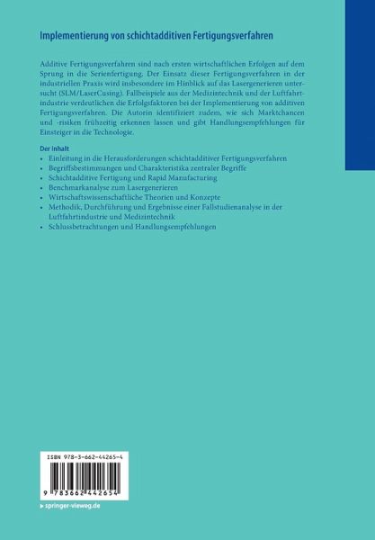 Einleitung.- Begriffsbestimmungen und Charakteristika zentraler Begriffe.- Schichtadditive Fertigung und Rapid Manufacturing.- Benchmarkanalyse zum Lasergenerieren.- Wirtschaftswissenschaftliche Theorien und Konzepte.- Methodik und Durchführung der Fallstudienanalyse.- Ergebnisse der Fallstudienanalyse.- Schlussbetrachtungen.