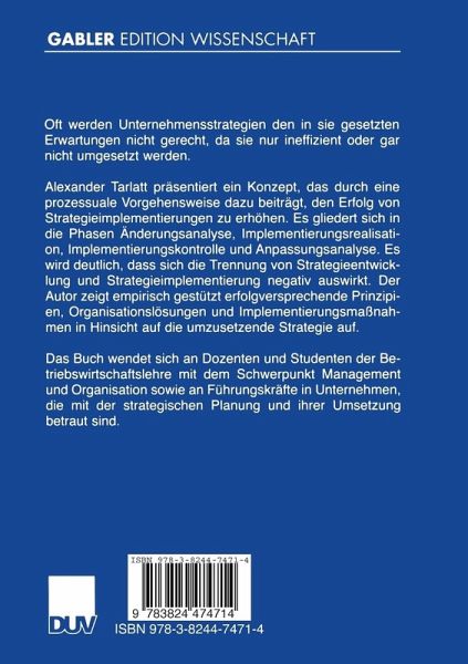 Alexander Tarlatt präsentiert ein Konzept, das durch eine prozessuale Vorgehensweise dazu beiträgt, den Erfolg von Strategieimplementierungen zu erhöhen. Es gliedert sich in die Phasen Änderungsanalyse, Implementierungsrealisation, Implementierungskontrolle und Anpassungsanalyse. Es wird deutlich, dass sich die Trennung von Strategieentwicklung und Strategieimplementierung negativ auswirkt. Der Autor zeigt empirisch gestützt erfolgversprechende Prinzipien, Organisationslösungen und Implementierungsmaßnahmen in Hinsicht auf die umzusetzende Strategie auf.