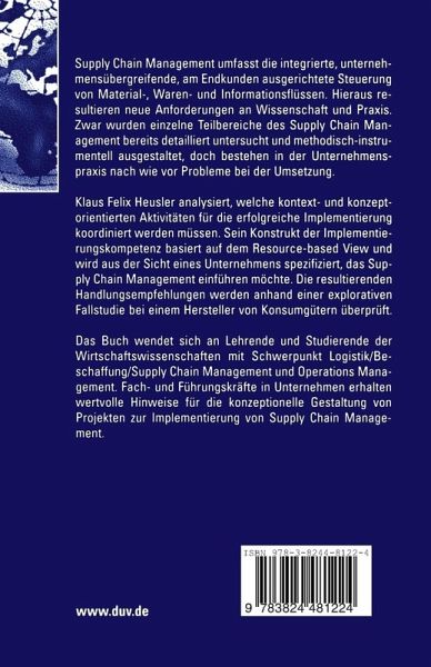 Klaus Felix Heusler analysiert, welche kontext- und konzeptorientierten Aktivitäten für die erfolgreiche Implementierung koordiniert werden müssen. Sein Konstrukt der Implementierungskompetenz basiert auf dem Resource-based View und wird aus der Sicht eines Unternehmens spezifiziert, das Supply Chain Management einführen möchte. Die resultierenden Handlungsempfehlungen werden anhand einer explorativen Fallstudie bei einem Hersteller von Konsumgütern überprüft.