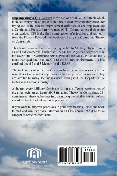 Implementing a CPI Culture is written as a "HOW TO" Book which includes everything an organization needs to know when they are either trying out some process improvement activities or are Implementing a Continuous Process Improvement (CPI) Culture across their entire organization. CPI is the fluid combination of principles and sub tools from the Process-Focused methodologies Lean, Six Sigma, and Theory of Constraints. This book is unique because it is applicable to Military Organizations as well as Commercial Businesses. MAQ has 35 years of experience in the USAF and US Army and helped generate the DoD CPI Guide. He is more than qualified to relate CPI to the Military environment. He is a certified Level 2 and 3 Mentor for the USAF. The techniques identified in this book have been proven successful at several Air Force and Army Bases as well as private businesses. They are similar to many techniques used throughout the Department of Defense and across industry. Although every Military Service is using a different combination of the three techniques; Lean, Six Sigma, and Theory of Constraints, CPI combines all these techniques into a single approach that makes the best use of each sub tool when it is appropriate. If you want to improve processes in your organization, this is the book to read and use. For more information on CPI, contact MAQ or Mike Maquet at www.m2mcpi.com.