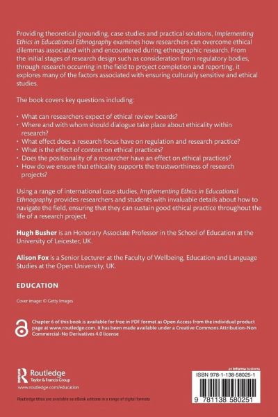 Foreword; Chapter 1 Introduction: Overview of the book; Section 1 Informing compliance with regulation; Chapter 2 Phrón¿sis and the ethical regulation of ethnographic research; Chapter 3 Ethical appraisal boards: Constitutions, functions, tensions and blind spots; Section 2 Applying Ethics in the field; Chapter 4 Ethics and access when consent must come first. Consequences of formalised research ethics for ethnographic research in schoolsChapter 5 Ethical research practice in educational institutions: Engaging with vulnerable participants; Section 3 Ethical dilemmas in the Field; Chapter 6 Double Agent: Ethical Considerations in Conducting Ethnography as a Teacher Researcher; Chapter 7 Ethical reflections on critical ethnography; Chapter 8 Ethical learning from an educational ethnography: the application of an ethical framework in doctoral supervision; Chapter 9 Emergent Issues in Ethnographic Ethics: Futures and Possibilities