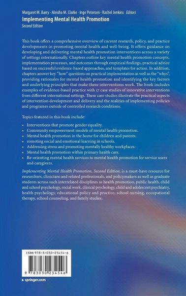 Implementing Mental Health Promotion, Second Edition, is a must-have resource for researchers, clinicians and related professionals, and policymakers as well as graduate students across such interrelated disciplines as health promotion, public health, child and school psychology, social work, clinical psychology, child and adolescent psychiatry, health psychology, educational policy and practice, school nursing, occupational therapy, school counseling, and family studies.