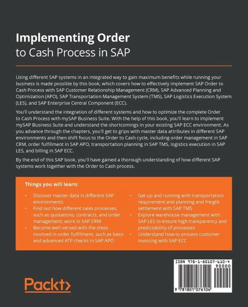 Implement critical business processes with mySAP Business Suite to integrate key functions that add value to every facet of your organization Key Features:Learn master data concepts and UI technologies in SAP systems Explore key functions of different sales processes, order fulfillment options, transportation planning, logistics execution processes, and customer invoicing Configure the Order to Cash process in SAP systems and apply it to your business needs Book Description: Using different SAP systems in an integrated way to gain maximum benefits while running your business is made possible by this book, which covers how to effectively implement SAP Order to Cash Process with SAP Customer Relationship Management (CRM), SAP Advanced Planning and Optimization (APO), SAP Transportation Management System (TMS), SAP Logistics Execution System (LES), and SAP Enterprise Central Component (ECC). You'll understand the integration of different systems and how to optimize the complete Order to Cash Process with mySAP Business Suite. With the help of this book, you'll learn to implement mySAP Business Suite and understand the shortcomings in your existing SAP ECC environment. As you advance through the chapters, you'll get to grips with master data attributes in different SAP environments and then shift focus to the Order to Cash cycle, including order management in SAP CRM, order fulfillment in SAP APO, transportation planning in SAP TMS, logistics execution in SAP LES, and billing in SAP ECC. By the end of this SAP book, you'll have gained a thorough understanding of how different SAP systems work together with the Order to Cash process. What You Will Learn:Discover master data in different SAP environments Find out how different sales processes, such as quotations, contracts, and order management, work in SAP CRM Become well-versed with the steps involved in order fulfillment, such as basic and advanced ATP checks in SAP APO Get up and running with transportation requirement and planning and freight settlement with SAP TMS Explore warehouse management with SAP LES to ensure high transparency and predictability of processes Understand how to process customer invoicing with SAP ECC Who this book is for: This book is for SAP consultants, SME managers, solution architects, and key users of SAP with knowledge of end-to-end business processes. Customers operating SAP CRM, SAP TMS, and SAP APO as part of daily operations will also benefit from this book by understanding the key capabilities and integration touchpoints. Working knowledge of SAP ECC, SAP CRM, SAP APO, SAP TMS, and SAP LES is necessary to get started with this book.